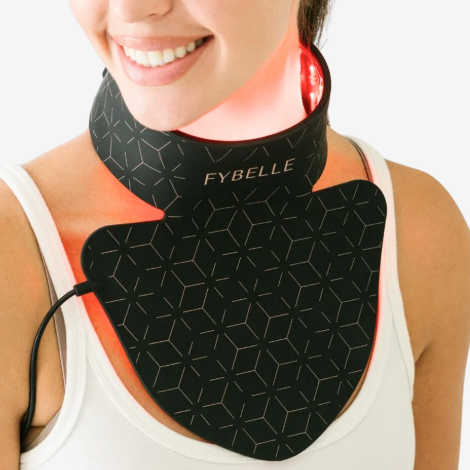 The Fybelle Radiance Pro LED Neck & Décolletage Mask uses targeted wavelengths of light to penetrate the skin at different depths. This helps stimulate cellular activity, boost collagen production, and improve skin firmness while reducing the appearance of fine lines and uneven skin tone on the neck and chest.